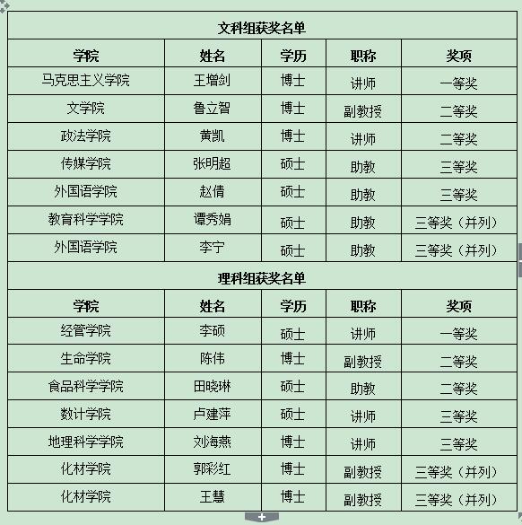 本次竞赛分文科组和理科组同时进行,竞赛内容由教案评选和课堂教学两部分组成,由校教学咨询与指导委员会委员和各学院有关专家组成评委组。经实名评分,文理科各评选出一等奖一名,二等奖二名,三等奖四名。