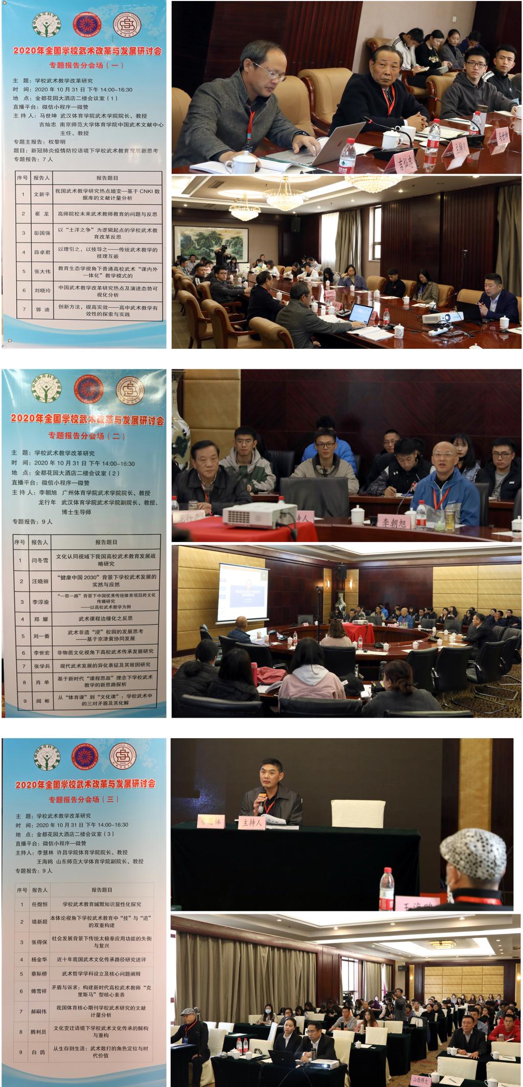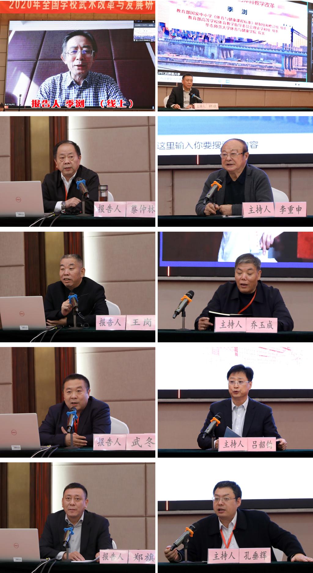 专题报告环节采用“线上报告+现场点评”的方式进行,来自全国19所高校的26位师生围绕“学校武术教学改革研究”、“学校武术发展研究”、“学校武术文化传承研究”3个主题做了专题发言,武汉体育学院马世坤教授、南京师范大学吉灿忠教授、广州体育学院李朝旭教授、武汉体育学院龙行年教授、许昌学院李慧林教授、山东师范大学王海鸥教授在会议现场对报告作了精彩点评。