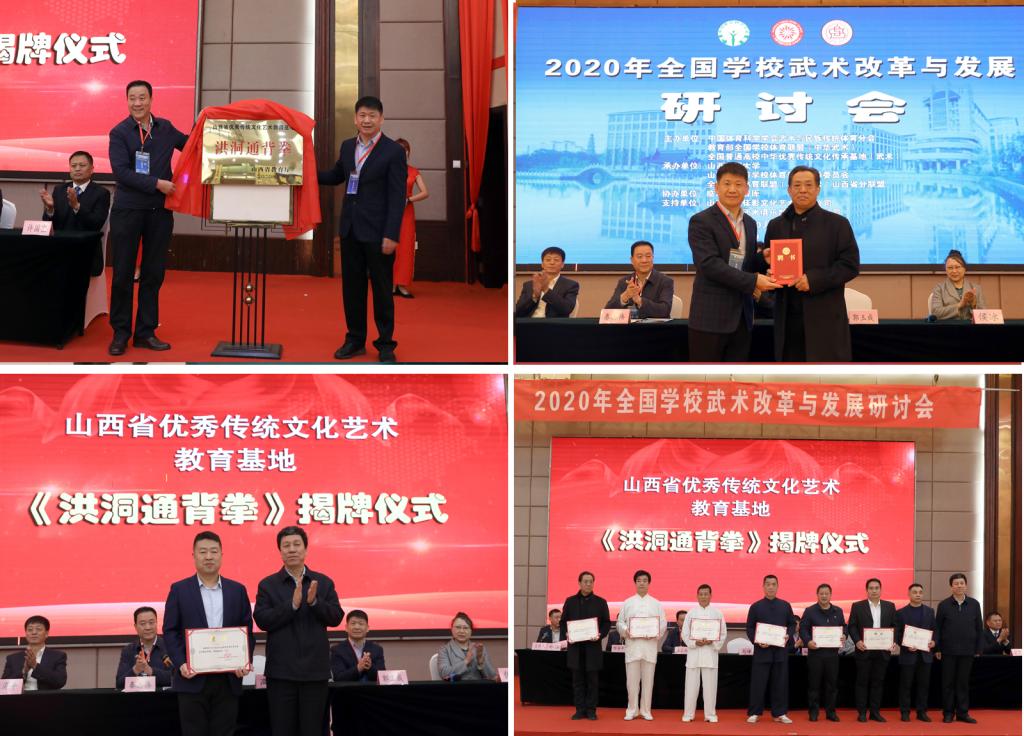 山西省教育厅体卫艺处一级调研员秦志伟宣读了省教育厅认定威尼斯官网为山西省优秀传统文化艺术教育基地的文件(洪洞通背拳),并对基地项目建设和充分发挥基地的示范引领作用提出了要求。会上进行了山西省优秀传统文化艺术教育基地揭牌及技术专家聘任仪式,并进行了技术展示。