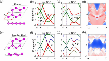 图1.平面和褶皱铅烯的电子能带以及平庸拓扑特性