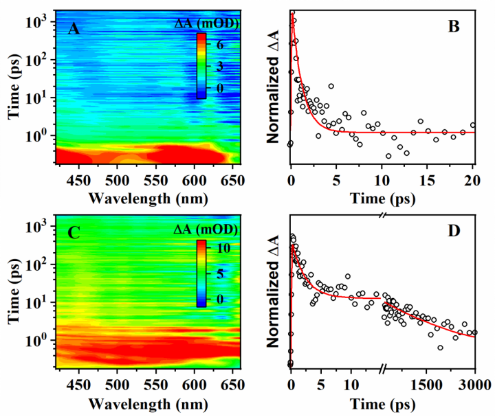 图2. 钠铒双钙钛矿纳米晶的飞秒瞬态吸收光谱,(A-B): Cs2NaEr0.5Cl6, (C-D): Cs2NaEr0.5Sb0.5Cl6。