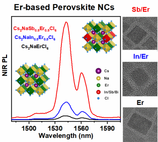 通过理论计算和稳态光谱、时间分辨荧光光谱及飞秒瞬态吸收光谱测量,发现增强的激子吸收、变长的荧光寿命、间接带隙适当的声子辅助过程及长寿命的暗俘获态有利于钙钛矿纳米晶材料的近红外发光。新设计的钠铒双钙钛矿纳米晶可以用于近红外发光二极管、光通讯及量子存储等领域。