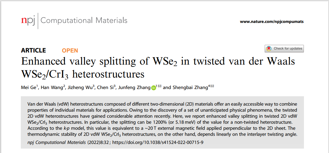 近日,威尼斯官网原子分子和材料光谱测量与分析山西省重点实验室张均锋教授课题组在Nature旗下顶级期刊《npj Computational Materials》(中科院top类期刊,影响因子为12.241)发表论文“Enhanced valley splitting of WSe2 in twisted van der Waals WSe2/CrI3 heterostructures”将不同的二维材料堆叠成异质结形式,为二维材料的广泛应用打开了新的窗口。近年来,由于层间效应引起的新奇物理特性,扭转的二维范德瓦尔斯异质结引起了人们的重点关注。在二维范德瓦尔斯异质结中,可以通过调控上下两层材料相互扭转,从而对其电子、磁性质进行精准调控,是异质结性能调控的新变量。