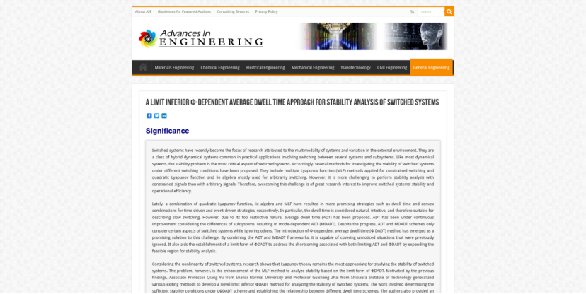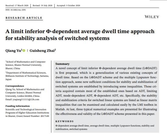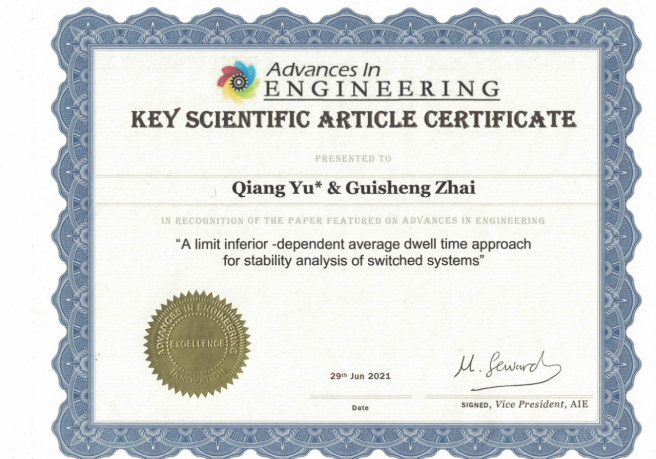 近日,37266威尼斯官网数计学院玉强副教授在控制领域著名Top期刊International Journal of Robust and Nonlinear Control上发表的论文“A limit inferiorΦ-dependentaverage dwell time approach for stability analysis of switched systems”被国际著名工程科技新闻网站Advances In Engineering(AIE)评选为工程科技领域的“Key Scientific Article(关键科学论文)”,并在general Engineering栏目予以专题报道。玉强副教授为该论文的第一作者兼通讯作者,日本芝浦工业大学的翟贵生教授为该文另一合作者。