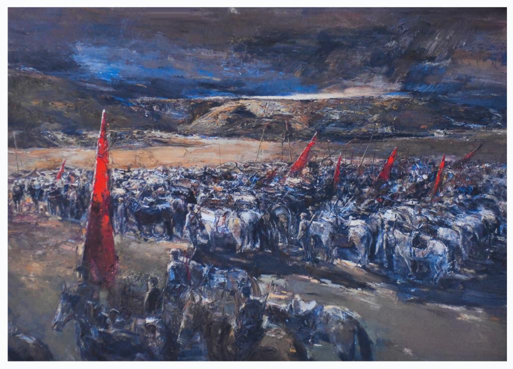 油画作品《黎明》由金小民教授历时半年精心创作而成,作品1.5*2.0(米),真实的再现了人民军队于黎明前整装待发东渡黄河的场景。该作品场面宏大、气势磅礴,构图均衡,注重整体明暗对比,色调凝重、浑厚,是艺术与思想的完美结合。
