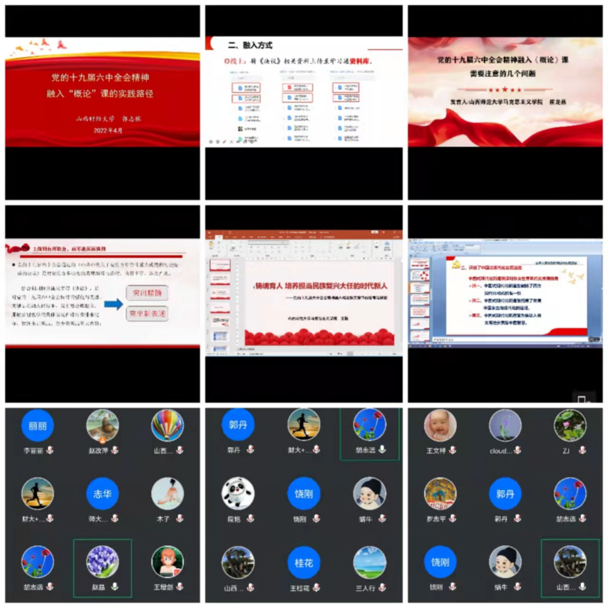 为深入推进党的十九届六中全会精神进教材、进课堂、进头脑,提升高校思政课教学质量,4月22日,威尼斯官网马克思主义学院联合山西财经大学、晋中学院马克思主义学院以线上视频会议形式召开党的十九届六中全会精神融入“概论”课集体云备课会,三所学校50余名教师参加会议。