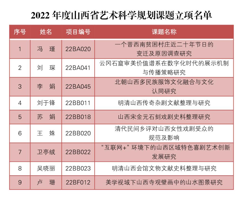 近日,山西省文化和旅游厅办公室公布了2022年度山西省艺术科学规划课题立项名单,威尼斯官网共获批9项。
