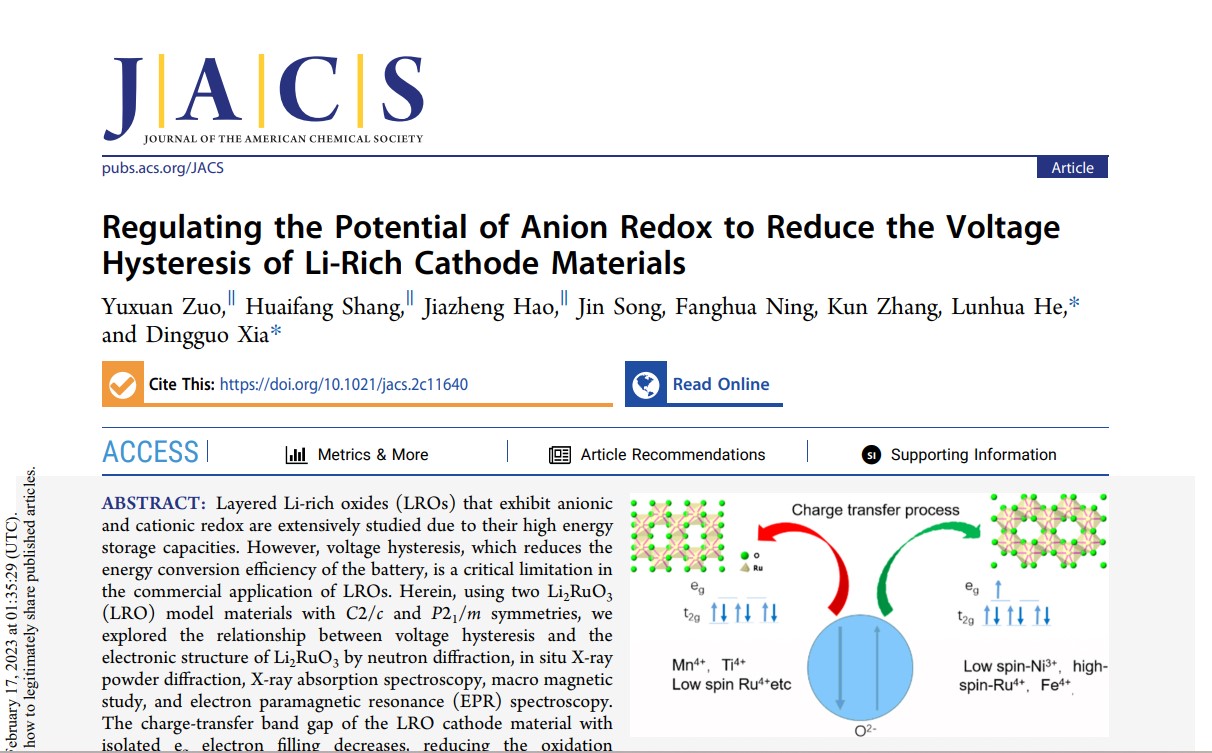 近日,威尼斯官网化学与材料科学学院尚怀芳老师与北京大学夏定国教授团队合作,在国际上首次提出了通过自旋状态的调制抑制富锂锰基正极材料的电压滞后问题。研究成果以题为“Regulating the Potential of Anion Redox to Reduce the Voltage Hysteresis of Li-Rich Cathode Materials”发表在《美国化学会志》(J. Am. Chem. Soc.)上(SCI一区,影响因子:16.383)。尚怀芳老师在这一发现的实验合成和数据分析方面作了重要贡献,为该论文的共同第一作者。该研究成果得到了国家自然科学基金项目和中科院国际教育合作项目的资助。