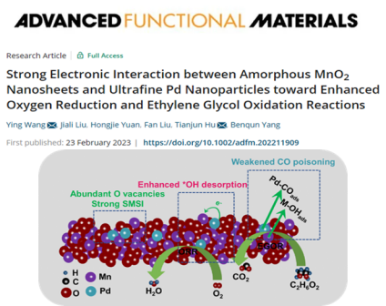 近日,威尼斯官网王瀛教授和胡天军副教授从优化电催化剂表面含氧物种吸附能出发,提出开发新型多功能电催化剂的新思路。研究成果以题为“Strong Electronic Interaction between Amorphous MnO2 Nanosheets and Ultrafine Pd Nanoparticles toward Enhanced Oxygen Reduction and Ethylene Glycol Oxidation Reactions”发表在《先进功能材料》(Advanced Functional Materials)上(SCI一区,影响因子:19.924)。该研究成果得到了山西省应用基础计划研究的资助。
